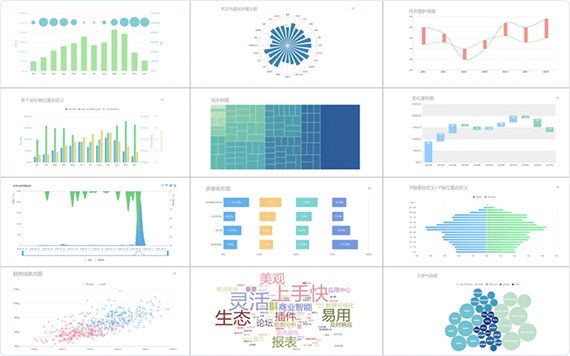 - 數(shù)十種的可視化圖表效果,包括柱形圖、折線圖、雷達(dá)圖、散點圖和詞云圖等,滿足不同人群的閱讀偏好,為您展示多樣數(shù)據(jù)信息提供全面支持